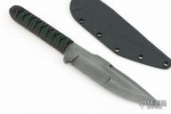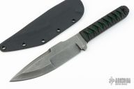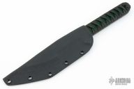 This Fighter by Sam Eddleman features an acid washed multiground blade with sharpened top edge, .223" blade stock and 1.541" blade depth, hidden tang construction. Handle is wrapped in a traditional Japanese style using epoxy soaked nylon cord over rayskin. Comes in a custom kydex sheath. Excellent condition.