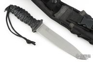 This knife features a bead blasted spear point tanto blade. 5/32" blade stock and 1 1/4" blade depth, full tang construction. The handle is black plastic. Comes with original sheath. Has some sheath scuffs, otherwise excellent condition.