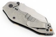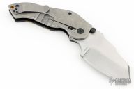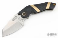 This knife has a satin finished stainless San Mai Damascus blade with fullers, notched thumbrest and dual thumbstuds. The handle has black G-10 scales with bronze inlays and pivot collars, tumbled titanium frame and tip up clip. Has stainless lockface insert with integral over travel stop. #113/250.  Comes with original packaging and makers card. Excellent condition.