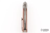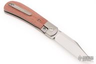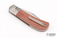 This Lanny's Clip Front Flipper by Enrique Pena features a satin finished blade with a front flipper and notched thumbrest. The handle has titanium bolsters, brown canvas micarta scales with a titanium backspacer and matching tip up pocket clip. Includes original box. Excellent condition.