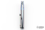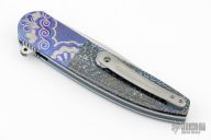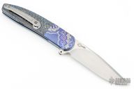 This L28M flipper by Andre Thorburn features a hand rub satin finished blade with polished flats, notched thumbrest and flipper. The handle has stippled/engraved titanium bolsters, black/blue silver lightning strike carbon fiber scales with red liners, anodized titanium liners, tip up milled titanium clip. Smooth action. Perfect lockup, detent and blade seating. Comes with a COA. Excellent condition.