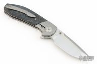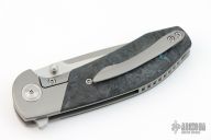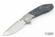 This VBR by Reate is a Mark Varga design, it features a satin finished blade with flipper. The handle has a bead blasted titanium frame with Dark Matter Blue carbon fiber scales, bead blasted titanium backspacer and tip up clip. Rides on ceramic bearings. Comes with original box and zippered case. Excellent condition.