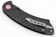 The Red Horse Knife Works Hell Razor P features a black PVD finished blade with dual thumbstuds and a notched thumbrest. The handle has marble carbon fiber scales with red G-10 pivot collars, inlaid stainless steel liners, tip up bead blasted titanium clip. Comes with original box. Excellent condition.