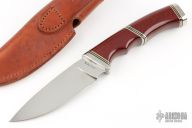 This knife by Randy Golden features a mirror polished blade with .186" blade stock and 1.250" blade depth, hidden tang construction. The handle has a stainless steel guard and butt, red linen micarta grip, stainless/black/brass spacers. Comes with a brown leather sheath. Has a few light scratches, otherwise excellent condition.