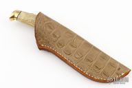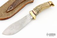 This knife by CP (please let us  know if you know who this is) features a satin finished blade with .125" blade stock and 1.376" blade depth, hidden tang construction. The handle has a brass guard and butt, stag grip with red spacers. Comes with a leather sheath. Has some patina on the blade and guard, has a few light scratches, otherwise good user condition.