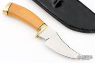 This knife by JM McRae features a mirror polished blade with notched thumbrest, .247" blade stock and 1.508" blade depth, hidden tang construction. The handle has a brass guard and butt, yellow paper micarta grip with black spacers. Comes with a black leather sheath. Has some light scratches, otherwise good condition. Dated 1974