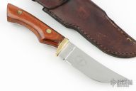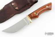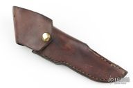 This knife by Terra Gladius features a satin finished blade with .129" blade stock and 1.135" blade depth, full tang construction. The handle has a brass guard and dymondwood scales with brass pins. Comes with a brown leather sheath. "TS-16580" on blade. Has some scratches, otherwise good condition.