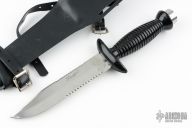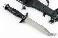 This knife by Fury features a mirror finished blade with false top edge, partial serrations, and saw teeth on the spine, .152" blade stock and 1.133" blade depth, hidden tang construction. The handle has a black grip and a stainless steel butt. Comes with a black rubber sheath. Has some light scratches and patina, otherwise good condition. #11467.