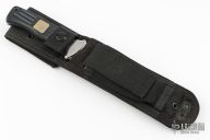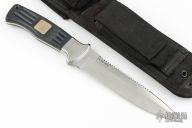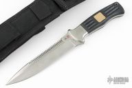This SERE fixed blade from Al Mar Knives features a double edged blade and serrations on top, .154" stock and 1.169" depth, full tang construction. The handle has black rubber scales, stainless steel bolsters.  Comes with black nylon sheath with stone. Excellent condition.