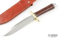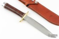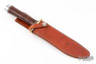 This Model 1-7 by Blackjack Knives features a satin finished blade with a false top edge, .219" black stock and 1.168" blade depth, hidden tang construction. The handle has a brass guard, stacked leather grip with red/white/black spacers, aluminum butt. Comes with brown leather sheath. Excellent condition.