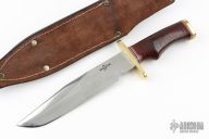 This Fighter by John Carson features a clip point satin finished blade with sharpened top edge, .239" blade stock and 1.459" blade depth, hidden tang construction. The handle has a brass guard and butt with a stacked leather grip and red/blue/white spacers. Comes with a brown leather sheath. Has some light scratches and oxidation spots, otherwise good condition.