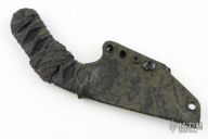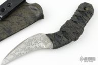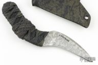 This knife by Joe Watson features an acid etch, hawkbill blade with .107" blade stock and 1.133" blade depth, full tang construction. The handle has black cord wrap over black cord under wrap with "grippy center". Comes with a kydex sheath and info card. New from maker!
