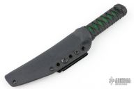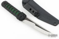 This Tanto by Joe Watson features an upswept multi-ground blade with satin finished grinds, reinforced point taper, .153" blade stock and .914" blade depth, hidden tang construction. The handle has black cord wrap over green stingray. Comes with a kydex sheath with belt clip and COA. New from Maker.