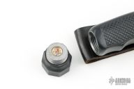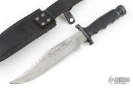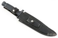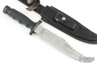 This Survival Master by Saburo features a satin finished blade with sawteeth on the spine, .161" blade stock and 1.746" blade depth, hollow handle constructon. The handle is black coated aluminum handle with removable butt cap with compass in the butt. Comes with a black leather sheath with sharpening stone. Has some light scratches and patina, otherwise excellent condition. #B182
