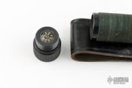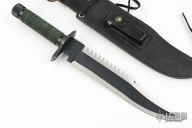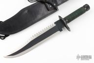 This Survival Bowie by Frost Cutlery features a two-tone finished blade with false top edge and sawteeth on the spine, .213" blade stock and 1.745" blade depth, hollow handle construction. The handle has a black steel guard, black aluminum with cord wrap and a removable butt cap that holds a compass. Comes with a black leather sheath with stone. Has a few light scratches and patina, otherwise excellent condition.