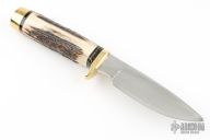 This knfie features a satin finished blade with mirror polished flats, false top edge, .222" blade stock and 1.437" blade depth, hidden tang construction. The handle has a brass guard and butt, stag grip and buffalo horn and brass spacers. The makers mark is very small, and looks like a snake around a knife or something, but it is so small, I could be wrong. Has a couple light scratches, otherwise excellent condition.