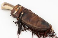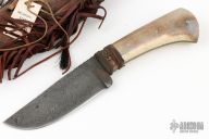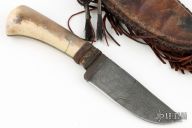 This knife by Master Smith Daniel Winkler features a Damascus drop point blade with a fileworked thumbrest and a full tapered tang construction, .207" blade stock and 1.426" blade depth. The handle has a copper guard with leather wrap, walrus ivory scales.  Includes a raw hide leather sheath. The scales have cracks in them at the pins, otherwise good condition.