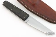 This tanto by Kevin L Hoffman features a bead blasted blade with temper line near the edge, .179" blade stock and 1.213" blade depth, full tang construction. The handle has black linen micarta scales with nickel silver liners. Comes with a brown leather sheath. Excellent condition.
