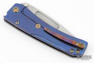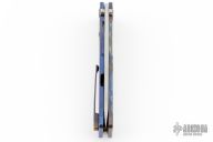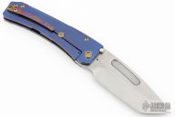 This Slim Midi Marauder from Medford Knife and Tool features a stonewashed drop point tanto blade with thumb stud and fullers. The handle is comprised of a milled and anodized titanium frame with tip up clip over a satin finished stainless steel spacers. Excellent detent, lockup, and seating. Original hard case and COA dated June 3, 2022. Has a couple light scratches, otherwise excellent condition.