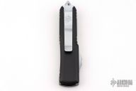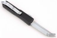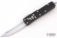 This UTX-85 Bounty Hunter by Microtech features a tanto blade with fullers, satin flats and white coated grinds. The handle has a black aluminum handle with white hardware, tip down white coated stainless steel clip. Comes with original box and papers. Excellent condition.