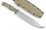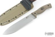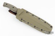 This GSo-8 by Survive Knives features a stonewashed drop point blade with .217" blade stock and 1.746" blade depth, full tang construction. The handle has green linen micarta scales. Exposed tang pommel with lanyard hole. Includes kydex sheath with belt loop. Excellent condition.
