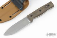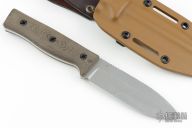 This GSO 4.1 from Survive Knives features a stonewashed drop point blade with .157" blade stock and 1.230" blade depth. The handle green linen micarta scales over full tang construction. Notched exposed tang pommel with recessed lanyard bail. Includes kydex sheath with belt loop. Excellent condition.
