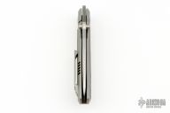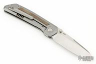 This Mula framelock by Enrique Pena features a satin finished drop point blade with swedge, notched thumbrest and dual thumbstuds. The handle has a bead blasted titanium frame with green canvas micarta inlays, a titanium backspacer with lanyard pin. Matching tip up titanium clip. Excellent condition.