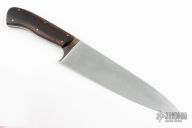 This Chef's Knife by Alden Cole has a thin satin finished blade with a full flat grind, with a heat treat finished ricasso, .098" blade stock and 1.832" blade depth, full tang construction. The handle has Walnut Dymalux scales with brass pins. Sharpened to 15 degrees. Heat treated with Cryogenic treatment. Comes with COA. New from maker!