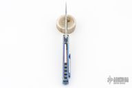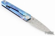 This icepick framelock front flipper from Sergey Rogovets features a Damasteel blade with notched front flipper. The handle has a White Timascus frame with a matching tip up pocket clip with hidden screws, timascus backspacer. Custom pivot screw. Nice detent, lockup and blade seating, rides on bearings. Locks up with no play, has a D2 lockface insert. Excellent condition. Number 2132 inside backspacer. Comes with original box and COA dated 4/2021