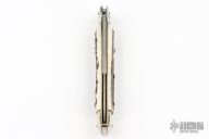 This pick lock auto by AGA Campolin features a mirror polished blade with a false top edge. Nickle silver guard and rear bolster and stag scales, brass liners. Nice function, strong firing. Has blade play and some scratches, otherwise good condition. Dated 2017. Comes with a leather slip sheath.