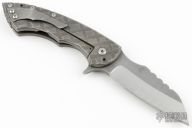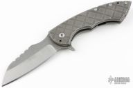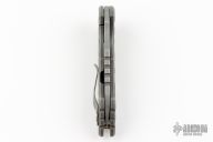 This Predator is a collaboration between James Brad Blount and Alphahunter Tactical Design. The blade is a modified sheepsfoot design with acid tumbled finish, notched spine and flipper. The handle is comprised of sculpted titanium with a matching tip up clip over satin titanium stand offs. Great blade seating, detent and lock up. Excellent Condition.