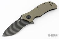 This 0301 frame-lock assisted flipper by Zero Tolerance features a recurve spear-point blade with a tiger stripe finish, stainless steel liner green G10 scale, and black titanium scale with a black G-10 back-spacer. It also features the Speed-safe assisted opening system. Tumble finished black stainless steel clip and lock bar stabilizer. Clip is 4-way reversible. S/N 11945. Comes with original box and papers. Has a couple light scuffs, excellent condition otherwise.