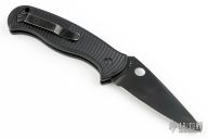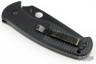 This Citadel auto by Spyderco features a black coated blade with swedge and thumb hole. Has notched thumbrest. Frame is milled and textured black aluminum with push button and safety. Clip is tip up carry, and reversible for right or left handed carry. Comes with Spyderco zipper case. Has some scuffs and scratches. Good condition.