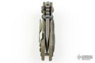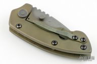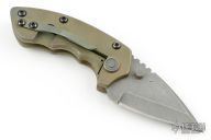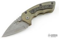 This linerlock folder by James Coogler features a dark tumble finished blade with dual thumbstuds and a notched thumbrest. The handle has a flamed titanium frame with matching titanium clip, tip up carry. Smooth action. G10 overlay. Nice blade seating, detent and lockup. Comes with zipper case. Has some light scuffs, otherwise Excellent condition.
