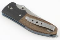 This Orion by Kirby Lambert features a satin finished recurve clip point blade with dual thumbstuds and notched thumbrest. The handle has carbon fiber bolsters, micarta scales, anodized bead blasted titanium liners, matching backspace with stainless ball inlays, and a tip up bead blasted stainless steel clip. Nice detent, lockup and blade seating. Comes with Maker's zipper case. Has a couple light scuffs, otherwise excellent condition.