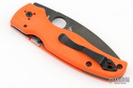 This Shaman PLN by Spyderco features a black spear point blade with notched thumb and finger rests, thumbhole. The handle has orange G-10 scales, inlaid stainless steel liners and a black stainless steel backspacer, 4-way reversible stainless steel clip, lanyard hole at the butt. Comes with original box and papers. New condition.