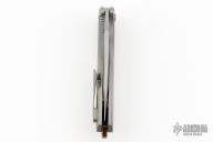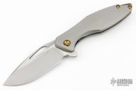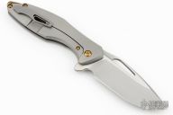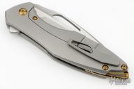 This Arius Flipper by Koenig knives features a two-tone blade with thumbhole and flipper. The handle has a bead blasted and milled titanium frame with anodized titanium backspacer and a bead blasted tip up clip with hidden screws. Has ceramic bearings and a ceramic detent ball. Nice detent, lockup and blade seating. Excellent condition. Comes with original box and COA dated December 21, 2022. Gen4B11