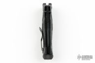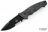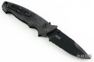 This MTF-3 by Mil-Tac features a black drop point partially serrated blade with notched thumbrest and dual thumbstuds. The handle has milled black G-10 scales, black stainless steel liners and backspacer, 4-way reversible black stainless steel clip. Nice detent, lockup and blade seating. Excellent condition.