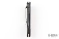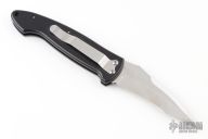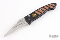 This Tsavo-Wraith Side Opening Auto has a mirror polished blade with notched thumb ramp and safety on the spine. Handle is black anodized aluminum with silver aluminum backspacer, and bead blasted silver stainless steel tip down clip. Wood inlays and lanyard hole. Dead center blade seating, and flawless action/ lock up. Excellent condition.