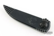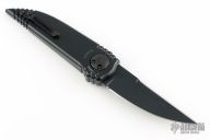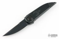This Phoenix model sports a black handle with a phoenix laser etching and a CPM-S30V steel blade with a black cerakote finish. The top edge of the knife has been sharpened.