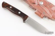 This Bravo-1 by Bark River Knives features a satin finished blade with .156" blade stock and 1.120" blade depth, full tang construction. The handle has ironwood scales with red  liners and a lanyard hole. Comes with a brown leather sheath, original box and papers. Excellent condition.