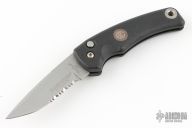 This Blackie Collins designed Sidewinder from Benchmark Knives features a bead blasted drop point blade with partially serrated edge. The handle is comprised of a polymer frame with stainless fittings and tip down pocket clip. Buttonlock auto opens smooth and crisp. Has a couple light scuffs and scratches, great condition otherwise.