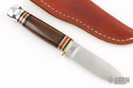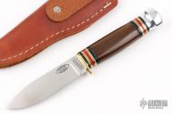 The knife has a satin finished blade with .210" blade stock and .957" blade depth, hidden tang construction. The handle has a brass guard, aluminum butt, green canvas micarta grip, black/brass/white/red spacers. Comes with brown leather sheath and original box. Excellent condition.