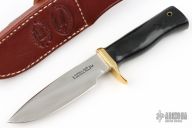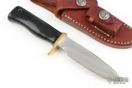 This Miniature model 28 features a satin finished drop point blade with notched thumbrest, .168" blade stock and .877" blade depth, full tang construction. The handle has a brass guard, black micarta grip and lanyard hole. Each miniature Randall model has a transponder in the handle matching the serial number of the knife, in this case "RKS 674/3981". Comes with brown leather sheath. Excellent condition.