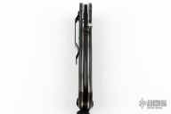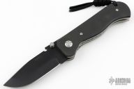 This Linerlock by Gene Baskette has a black tanto clip point blade with notched thumb rest, and thumbstud. Handle is black G10 with titanium liners, stainless standoffs, lanyard hole and tip down black stainless steel clip. Nice detent, lockup and blade seating. Has a couple light scuffs, excellent condition otherwise.
