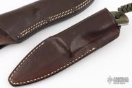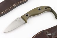 This Mule Team knife by Spyderco features a satin finished blade with .102" blade stock and 1.307" blade depth, full tang construction. The handle has green G-10 scales done by Screech Owl Knives. Comes with two brown leather sheaths. Has a couple scratches, otherwise excellent condition.