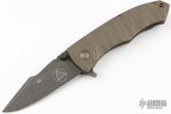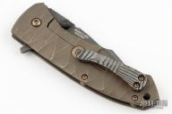 4 3/8" closed. 3 1/8" black acid wash finish CPM-S30V stainless blade with extended tang and dual thumb studs. Custom primal carved bronze and gold handles. Lanyard hole. Custom finish pocket clip. Has some light scuffs, otherwise excellent condition.