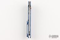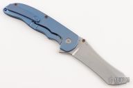 This Norseman (#6225) by John Grimsmo features a stonewashed blade with a single anodized titanium thumb stud, notched thumb ramp and flipper. Stonewash and anodized finished titanium frame with anodized titanium screws. Has a matching clip with hidden screws. Very smooth action that requires no wrist movement. Nice detent, lockup and blade seating. Rides on ceramic bearings. Comes with original packaging, custom hard case, Nano-Oil, tool, and COA dated July 27, 2022. Excellent condition.