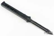 Joining the Estiletto OTF lineup is this fantastic model with a USA cutout on the black anodized aluminum body with black hardware/clip and a black coated dagger blade with partially serrated cutting edge.