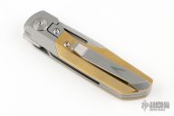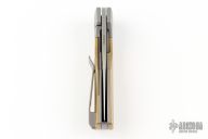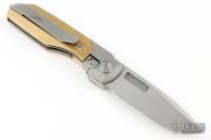 This Synapse Mini Second Run Folder by Vero Engineering features a hand rub satin finished blade with notched thumbrest and flipper. The handle has a tumbled titanium frame with brass scales, tip up titanium clip with hidden screws. Rides on bearings, nice detent, lockup and blade seating. Comes with zippered case and COA #810. Excellent condition.